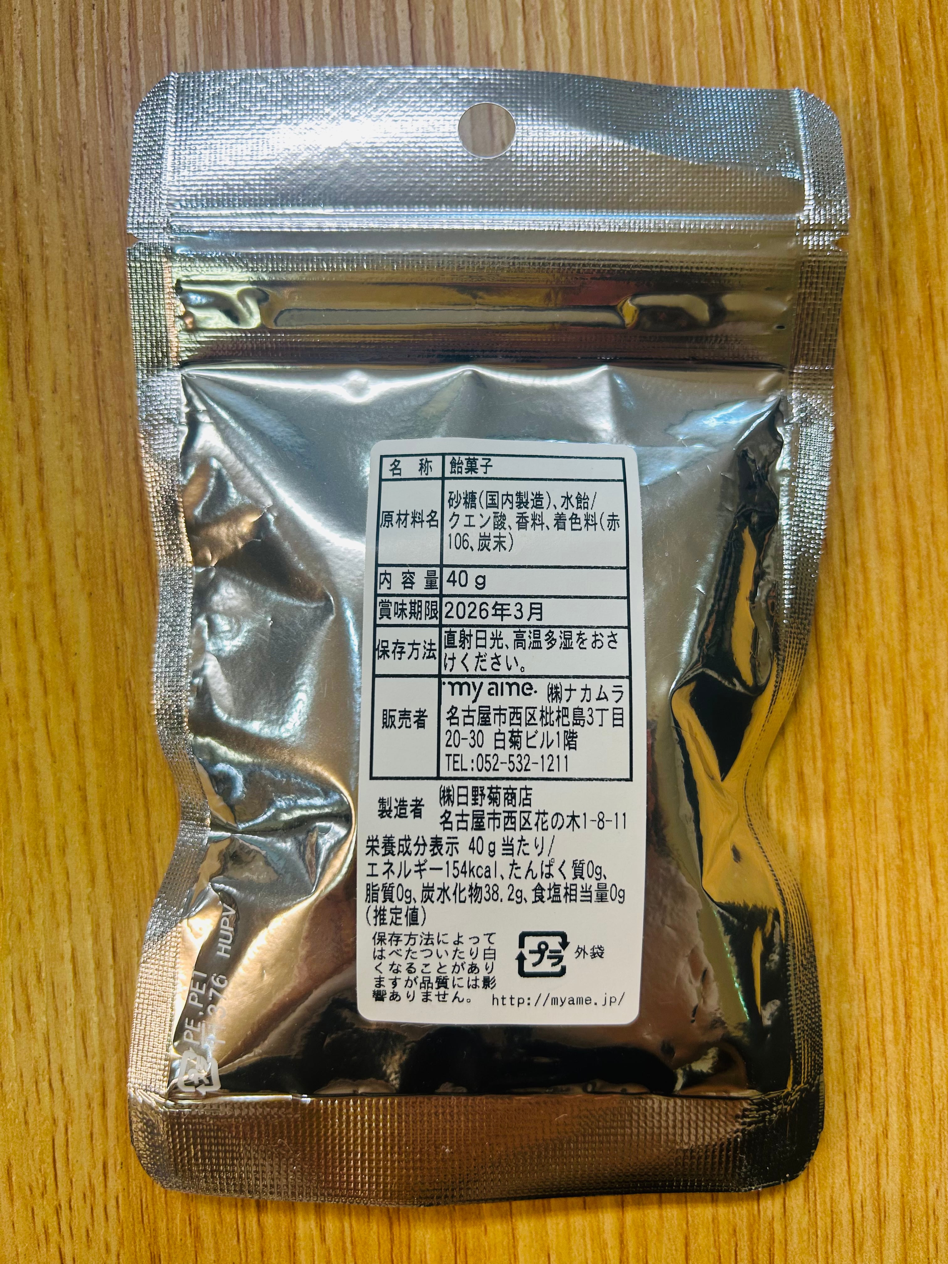 原材料名 :砂糖(国内製造)、水飴/クエン酸、香料、着色料(赤106、炭末)